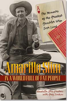 Amarillo, Texas![]() Bio Amarillo Slim is America's greatest gambler of all time. He's larger than life, and at a lanky 6' 4" and never without his snakeskin-wrapped Stetson and custom-designed cowboy boots, he makes a lasting impression. The term "living legend" gets tossed around a lot, but consider that Slim played himself in Robert Altman's California Split, and country singer John Lutz Ritter wrote a song about him"Do You Dare Make a Bet with Amarillo Slim?" After winning the World Series of Poker in 1972, he authored Play Poker to Win, published in hardcover by Grossett & Dunlap in 1973 and in paperback by Bantam in 1976. Project Description The book, Amarillo Slim in a World Full of Fat People, which will be published in April 2003 for the World Series of Poker, includes tales of Slim's life as a pool hustler, cardsharp, and proposition bettor mixed in with age-old wisdom and poker secrets. Slim will also describe some of his greatest gambling exploitsfrom winning the World Series of Poker in 1972 to creating proposition bets that rivaled the great Titanic Thompson's to running the biggest black market in Europe during the war while giving pool exhibitions (read: hustling) on military bases for Uncle Sam. Among his most famous bets, Slim beat Minnesota Fats playing pool with a broom and Rick Barry shooting free throws with a football. He took Willie Nelson for $300,000 playing dominoes; Bobby Riggs for $100,000 playing ping-pong (with a skillet!); and Larry Flynt for $2 million playing poker. He's won bets for rafting down the "River of No Return," riding a camel through the fanciest casino in Marrakesh, and driving a golf ball more than a mile. A few of his poker adversaries over the years have included presidents Lyndon Johnson and Richard Nixon, and drug lords Pablo Escobar and Jimmy Chagra. Slim has appeared on the Johnny Carson show eleven times and looks forward to making a national television tour when the book is released in April 2003. For more information, visit www.thepokermba.com/amarilloslim. |